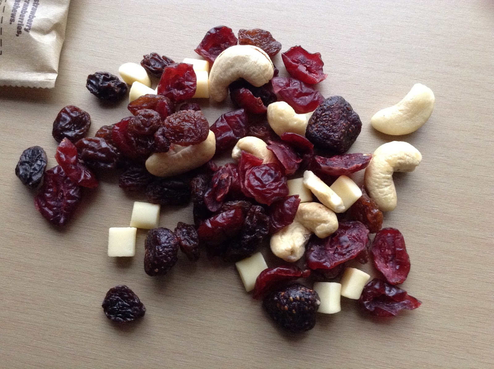 It's a mixture of dried mini Senga Sengana strawberries, strawberry flavour raisins, cashew nuts, and white chocolate. The bag cost around 80p or so. I'm guessing they're trying to capitalize on the trend for trail mixes, like Galaxy Bounty and M&Ms are.